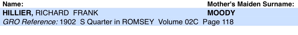 Richard Frank Hillier, was born on Saturday the 28th of June 1902, at Awbridge, Romsey, Hampshire, England.