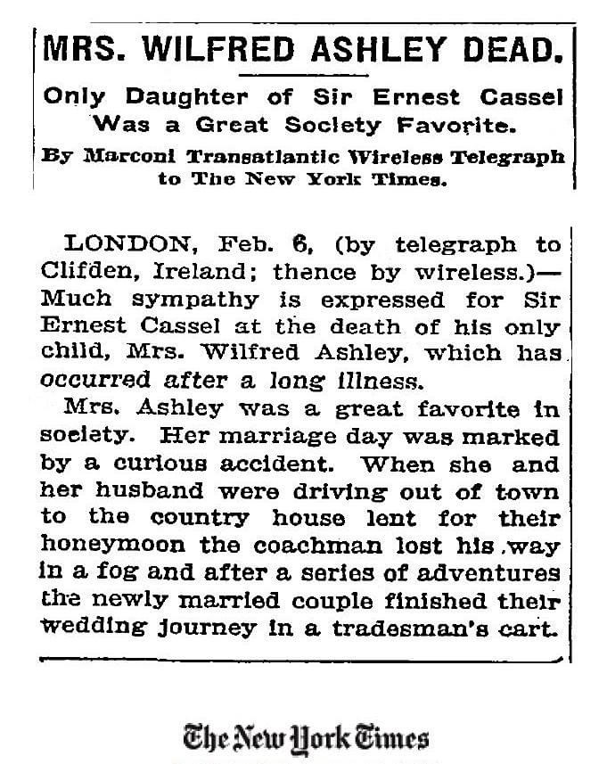 The Mother of Edwina Mountbatten, Amalia Mary Maud Ashley (Cassel), died on the February 05, 1911, after a long illness. She was buried at Romsey, at the Botley Road Cemetery.