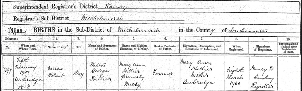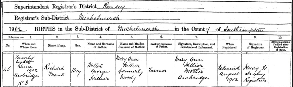 Mary Ann travelled to Romsey and registered his birth in Romsey on Monday the 11th of August 1902.