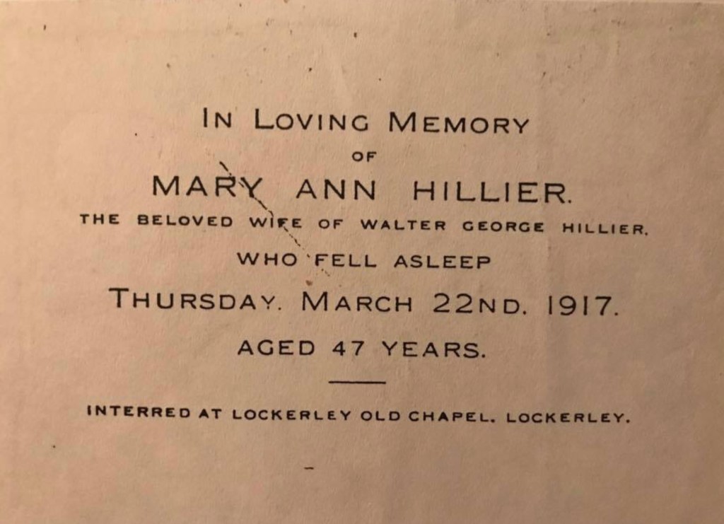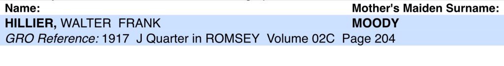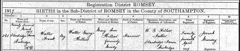 Heartbreakingly their joy was very short lived, as on the same day, Thursday the 22nd of March 1917, at Standbridge Farm, Awbridge, Romsey, Hampshire, England, Walters beloved wife, Mary Ann Hillier nee Moody, died after giving birth to Walter Frank, at the terribly young aged of 47.