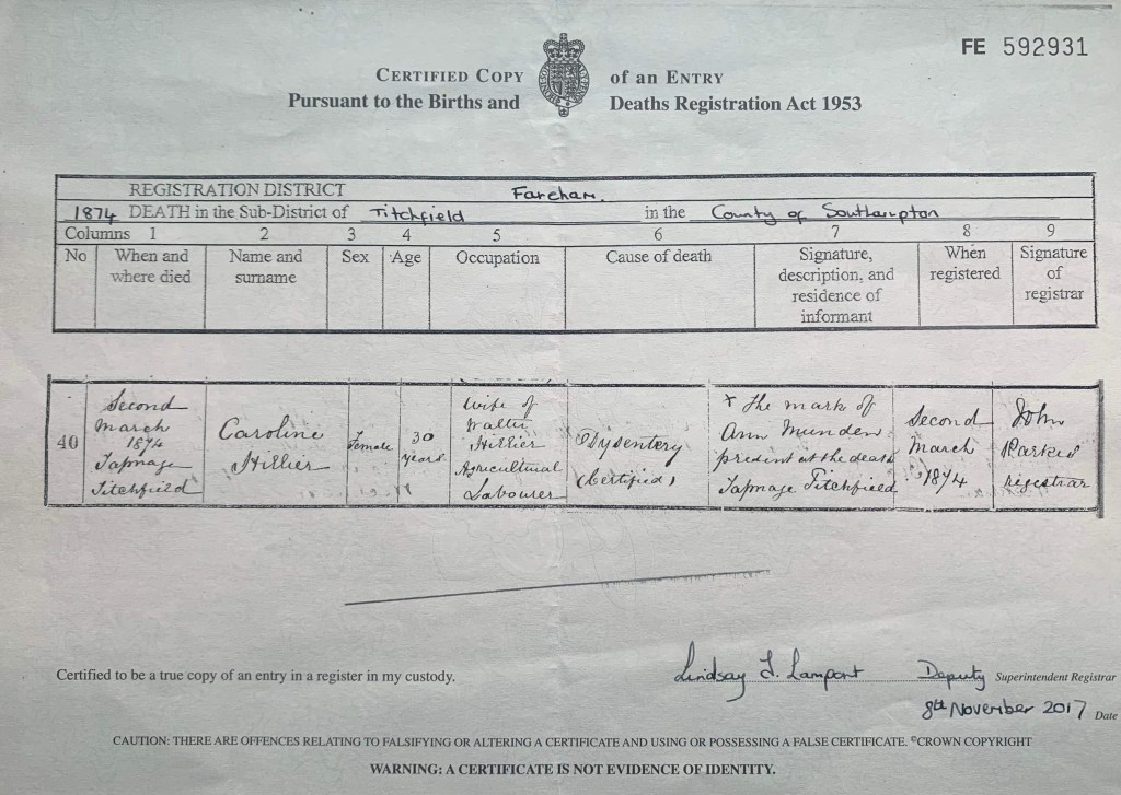 Sorrowfully two short years later, on Monday, the 2nd of March, 1874, Walters Mum, Caroline Hillier nee Abraham, died at, Tapnage, Titchfield.