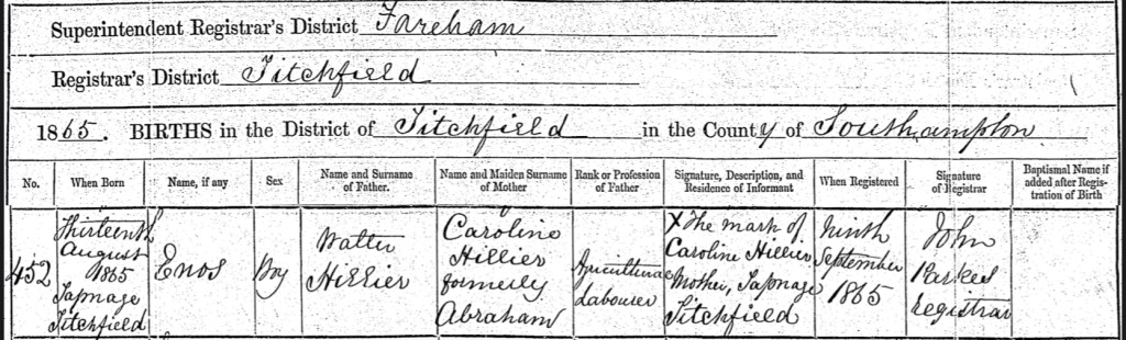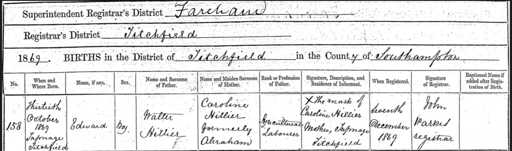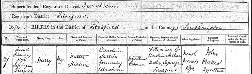At the registers, Caroline signed the birth register with an X and once again confirmed that her husband, Walter Hillier (Senior) was working as a Agriculture Labourer at the time of Harry’s birth.