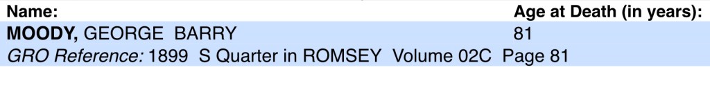 On Thursday the 26th of August 1899, Walters Step Grandfather, George Barry Moody, of Butlers Wood, Lockerley, passed away, at Butler’s Wood, Awbridge, Lockerley, Romsey, Hampshire, England, aged 81.