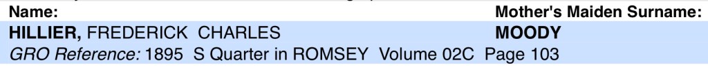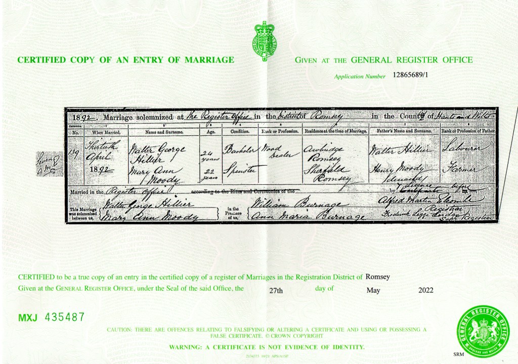 It wasn’t long before Walter fell in love with a local girl and at the age of 24 year old, bachelor, Walter George Hillier, married, 22 year old, spinster, Mary Ann Moody, daughter of Mr. Henry Moody and Mrs. Ann Moody nee Bessant, on Wednesday the 13th of April 1892, at the Register Office, Romsey, Hampshire, England.