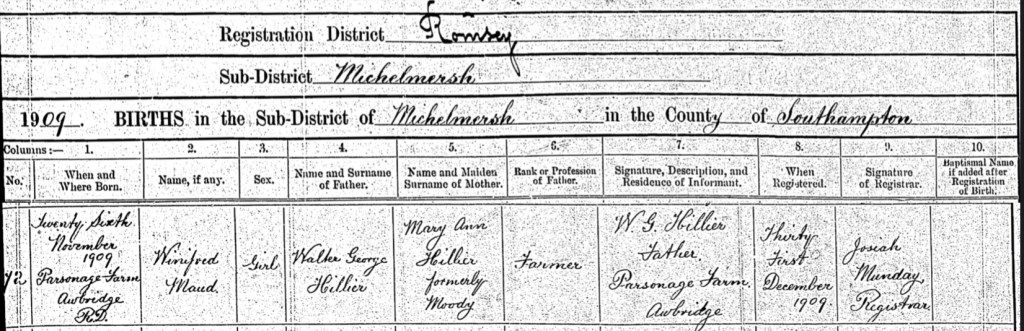 Walter did the honours and registered Winifred’s birth in Romsey, on Friday, the 31st December, 1909.