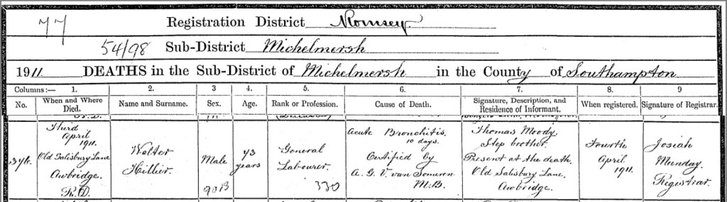 Just a day later on Monday the 3rd of April 1911, at Old Salisbury Lane, Romsey, Hampshire, England, Walters Father, Walter Hillier, a General Labourer, died from, Acute Bronchitis (10 days), when he was 73 years old.