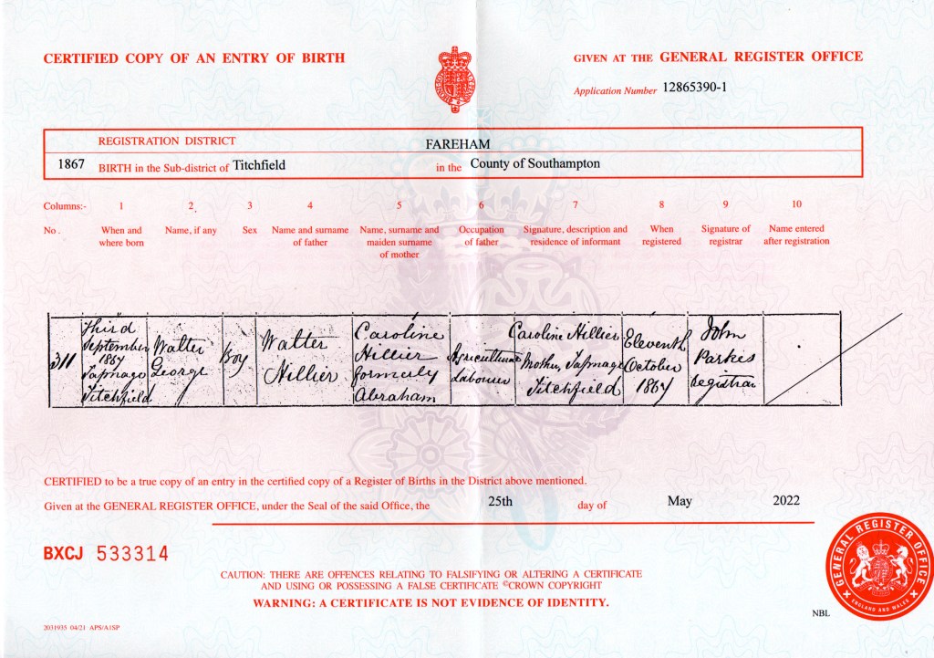 On the 11th of October 1867, Walters Mum, Caroline, traveled to Fareham, possibly by horse and trap to register Walters birth.