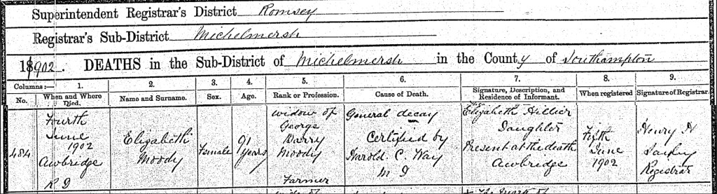 Her Daughter, Elizabeth Hillier, from Awbridge, was present and registered her death on the 5th of June 1902.