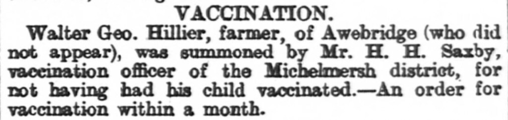 The Mayor and Colonel Griffiths lft the Bench during the nest two cases. – Frank Littlekil, labourers, of Sherfield, was summoned for not having his child vaccinated, and an order was made for it to be done within a month. – Walter George Hillier, farmer, of Michelmersh, who was similarly summoned, was fined 5s. and costs.