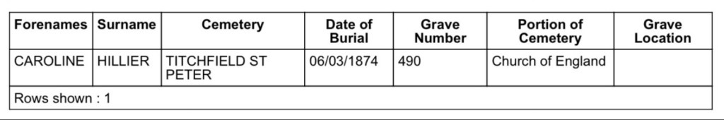 On Friday, the 6th of March 1874, the Hillier family, made their way to St. Peters, Churchyard, St Peters Church, Titchfield, Hampshire, most like in their Sunday bests, where they laid Caroline to rest, in grave number 490.