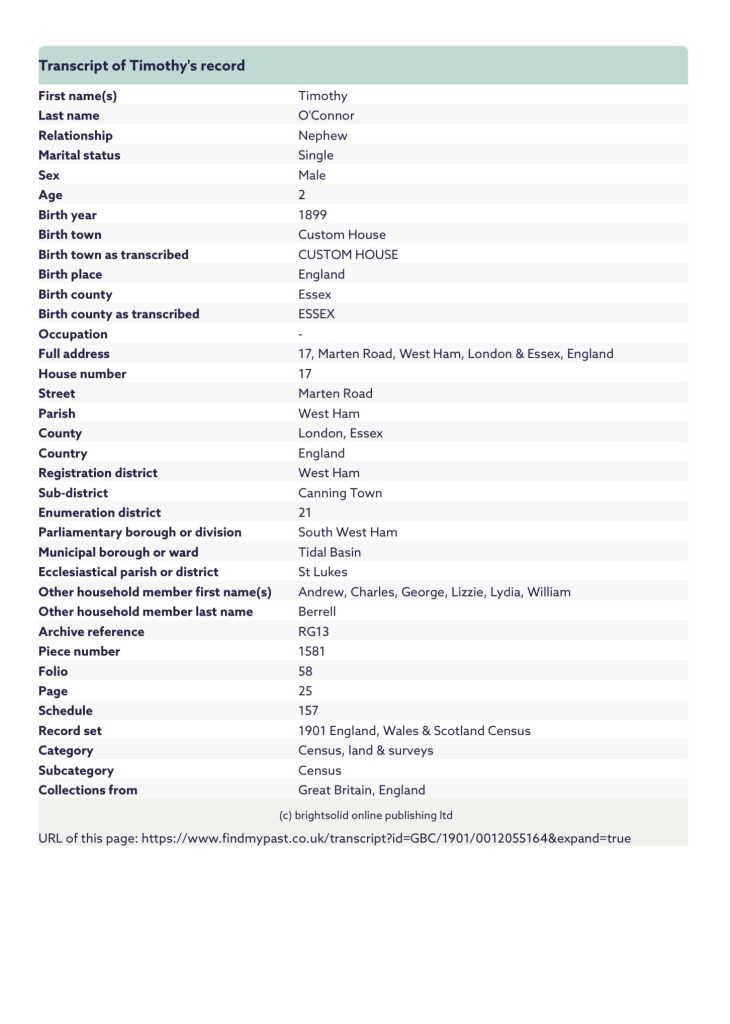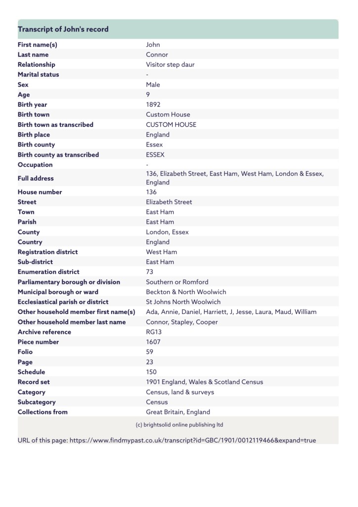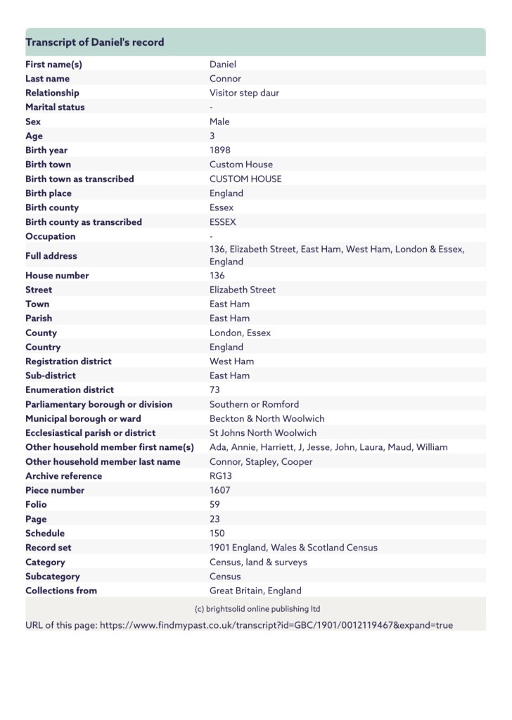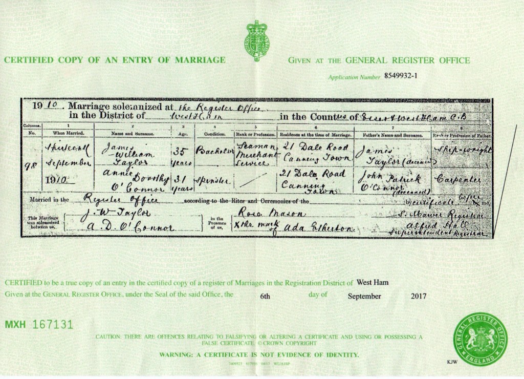 She registered Annie as Ann O’Connor and gave their residential address as, Number 6, Shirley Street, Canning Town, Plaistow, West Ham, Essex, England and her husbands occupation as a Dock labourer.