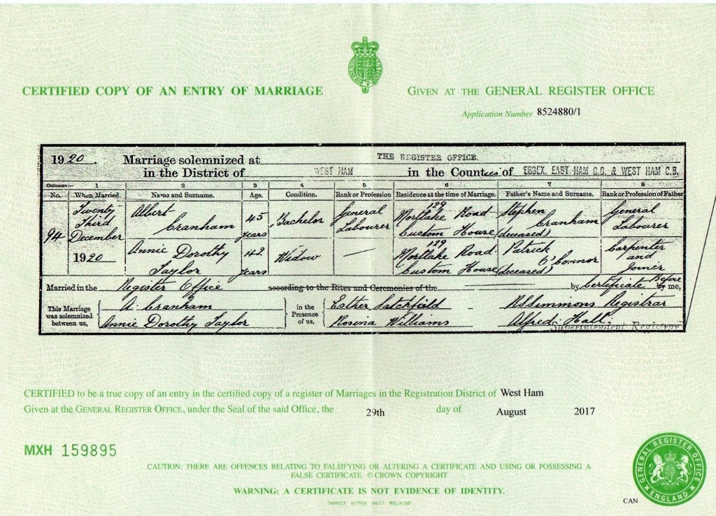 Johns sister, Widow, Annie Dorothy Taylor nee O’Connor, found love again and married 45 year old, bachelor, Albert Cranham, son of, Mr Stephen Cranham and Mrs Sarah Cranham, at The Register Office, West Ham, Essex, England on Thursday the 23rd of December 1920 when she was 42 years old. Their witnesses were, Esther Latchfield and Annie’s sister Rosina Williams nee O’Connor.