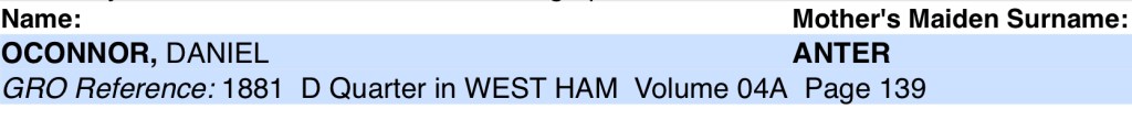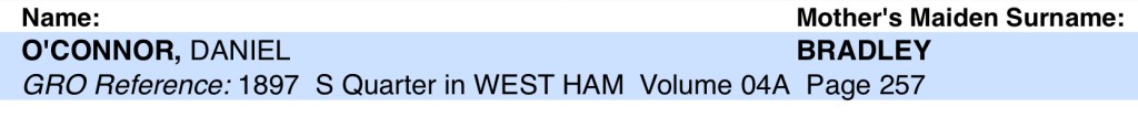 John’s Brother, Daniel O’Connor was born on Tuesday the 1st November 1881, at Number 8, Montesquieu Street, Plaistow, Canning Town, West Ham, Essex, England.