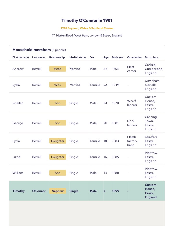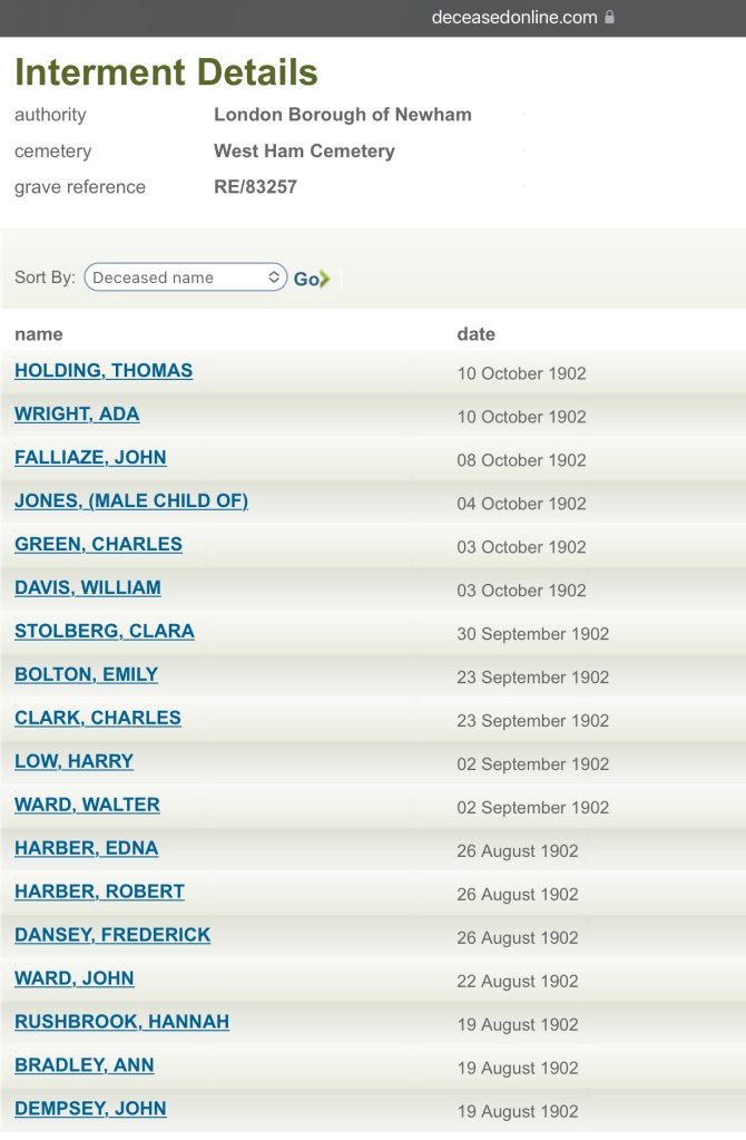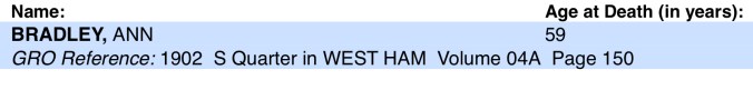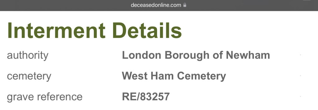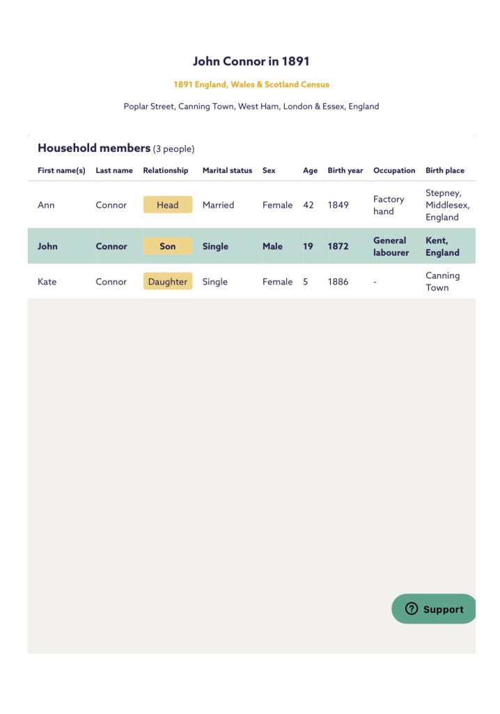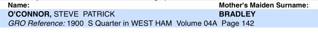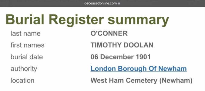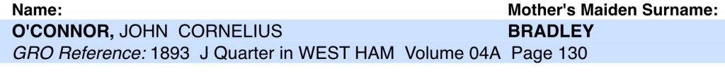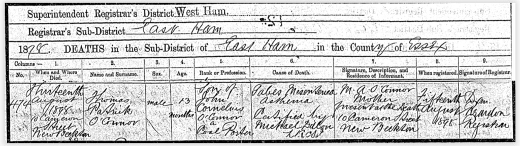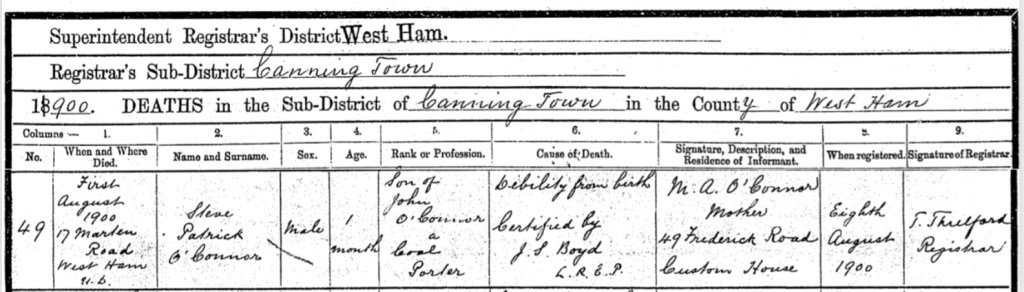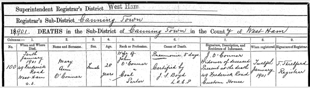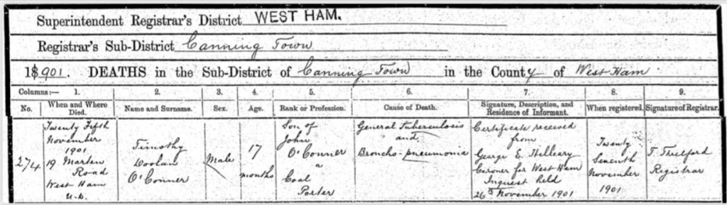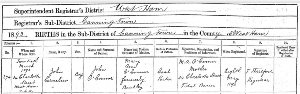 His Mum, Ann O’Connor, of 35, Tucker Street, Canning Town, registered his death. She gave John’s occupation as, a labourer.