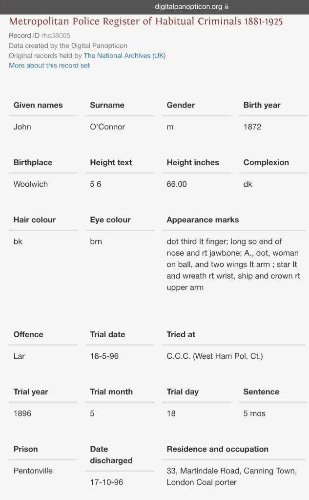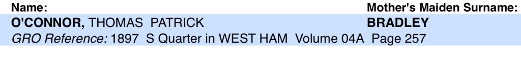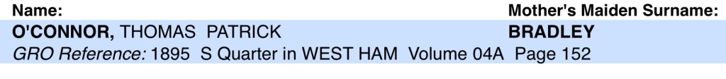 John’s brother, Thomas O’Connor was born on Sunday, the 3rd of March, 1878, at Number 53, Devas Street, Bromley, Poplar, Bow, Middlesex, England.