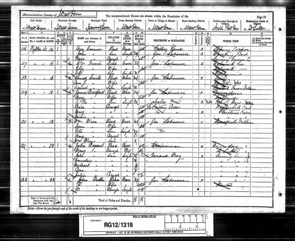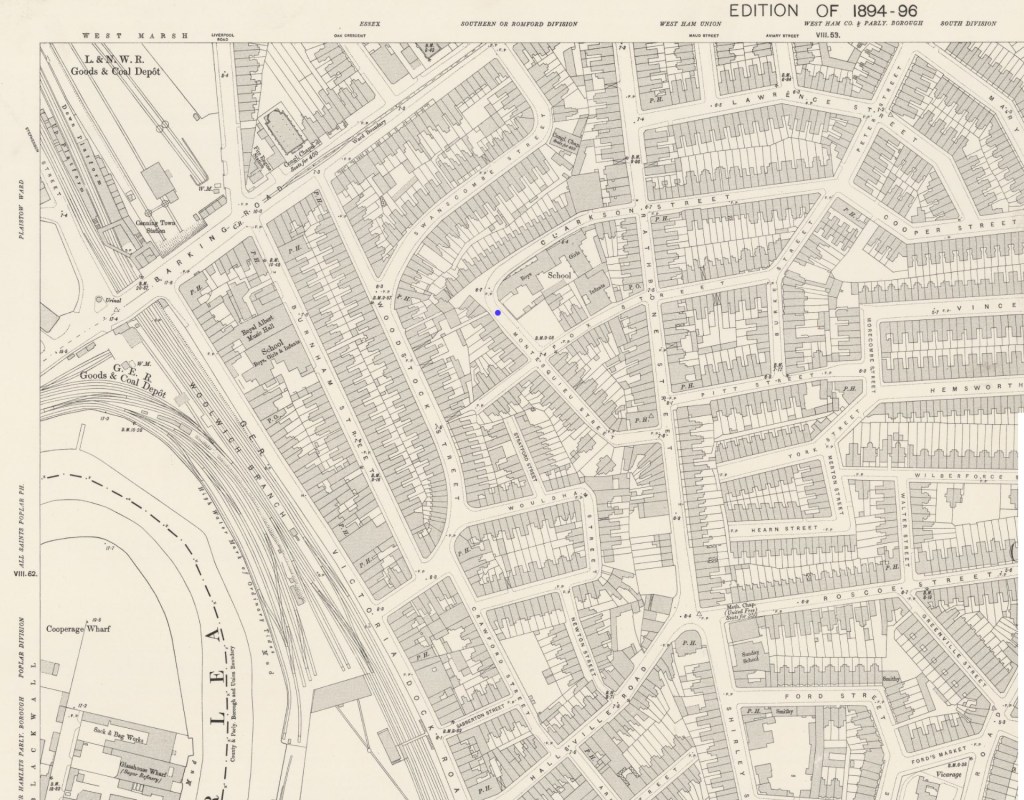 She gave her husband John’s occupation as a Labourer and their abode as, Number 53, Devas Street, Bromley.