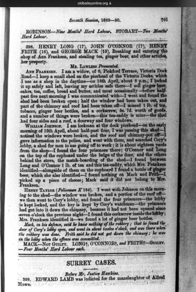 398. HENRY LONG (17), JOHN O’CONNOR (17), HENRY FRITH (16), and GEORGE MACK (15) , Breaking and entering the shop of Ann Franksen, and stealing tea, ginger beer, and other articles, her property.