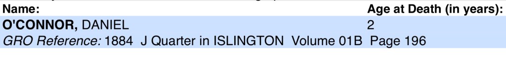 Sadly less than four years later, John’s Father John Patrick O’Connor, on the 3rd of January, 1887, at Number 1, Montesquieu Street, Plaistow, Canning Town, West Ham, Essex, England, aged 38, from, Bronchitis.
