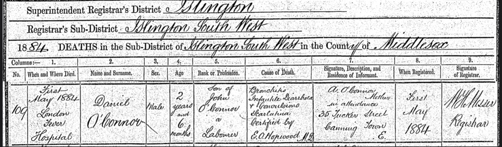 Daniel died on the 1st May, 1884, at the, The London Fever Hospital, Liverpool Road, Islington, Middlesex, England, aged 2 years and 6 months. His cause of death was, bronchitis, infantile diarrhoea, convulsions, and scarlatina (scarlet fever).