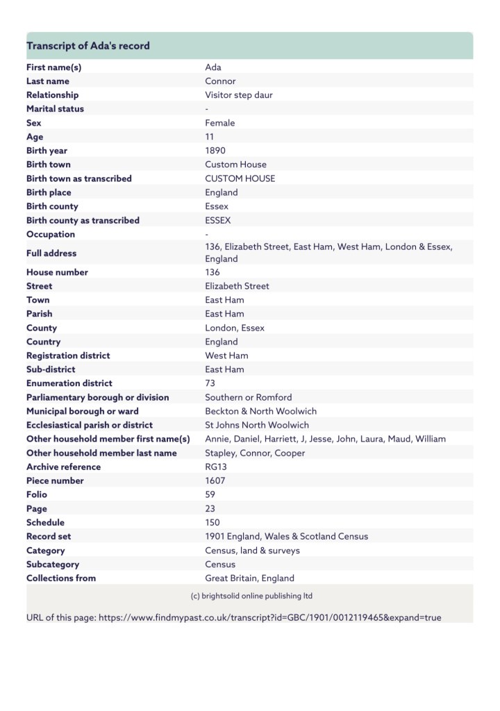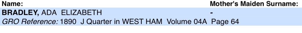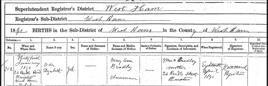 And on Friday the 31st of January, 1890, at 24 Rendel Road, Plaistow, Canning Town, West Ham, Essex, England, Mary Ann Bradley gave birth to a daughter whom she named Ada Elizabeth O’Connor.