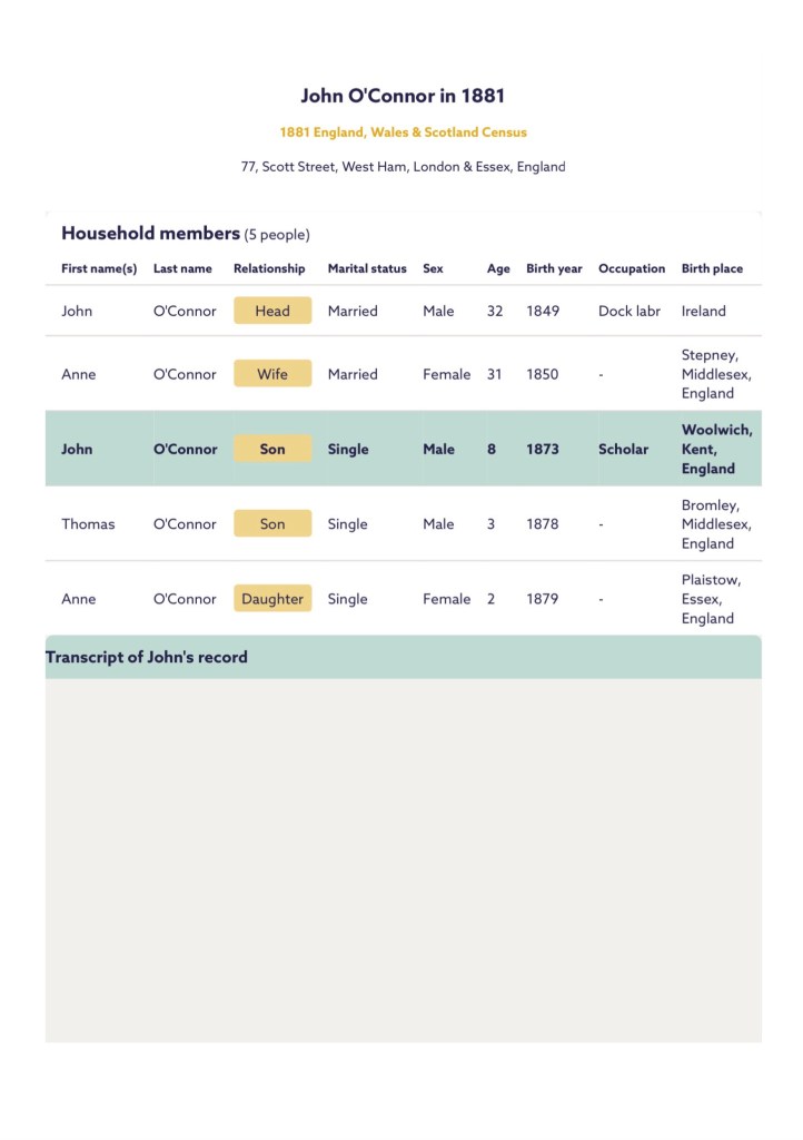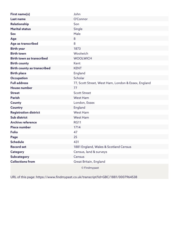 On the eve of the census, Sunday the 3rd of April, 1881, John his parents Patrick and Ann and siblings Thomas and Annie, were residing at, 77, Scott Street, Canning Town, West Ham, London & Essex, England. Patrick was working as a Dock Labourer and John was a Scholar.