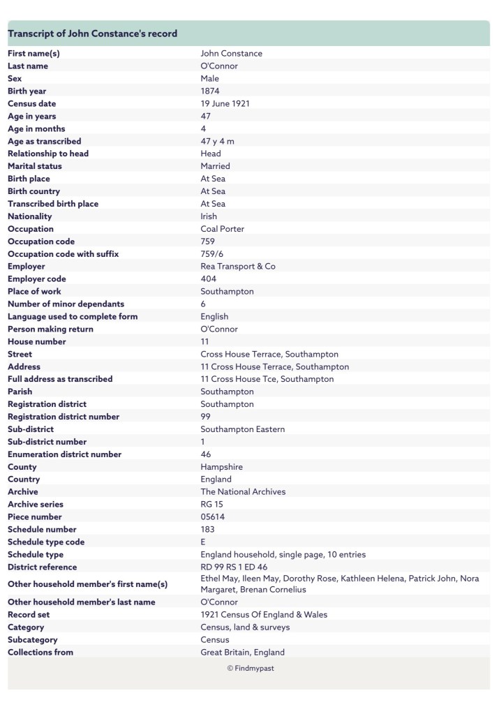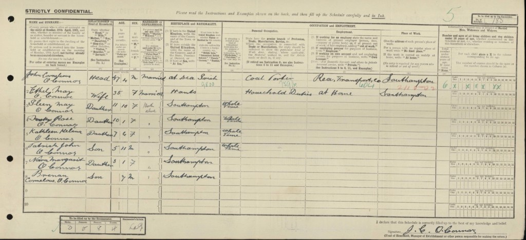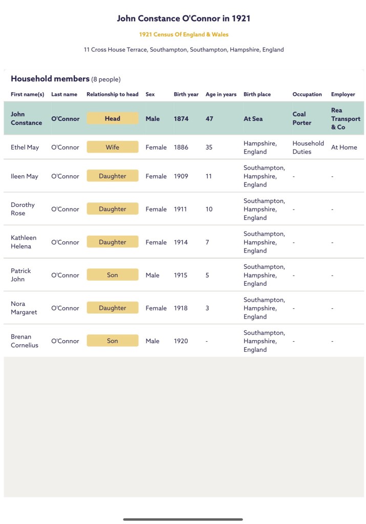 Just under 6 months later, the 1921 census was taken on Sunday the 19th June 1921. It shows the John O’Connor was residing at Number 11, Cross House Terrace, Southampton, Hampshire, England, with his wife Ethel May and children, Eileen May, Dorothy Rose, Kathleen Helena, Patrick John, Nora Margaret and Brennan Cornelius O’Connor. John Cornelius was working for Rea Transport & Co, as a Coal Porter.
