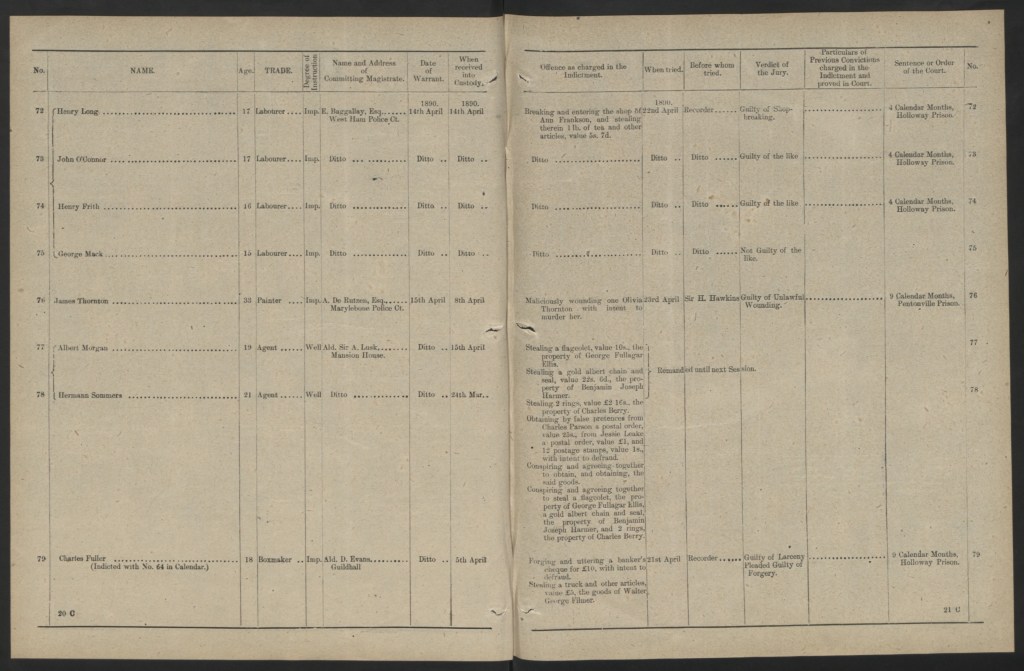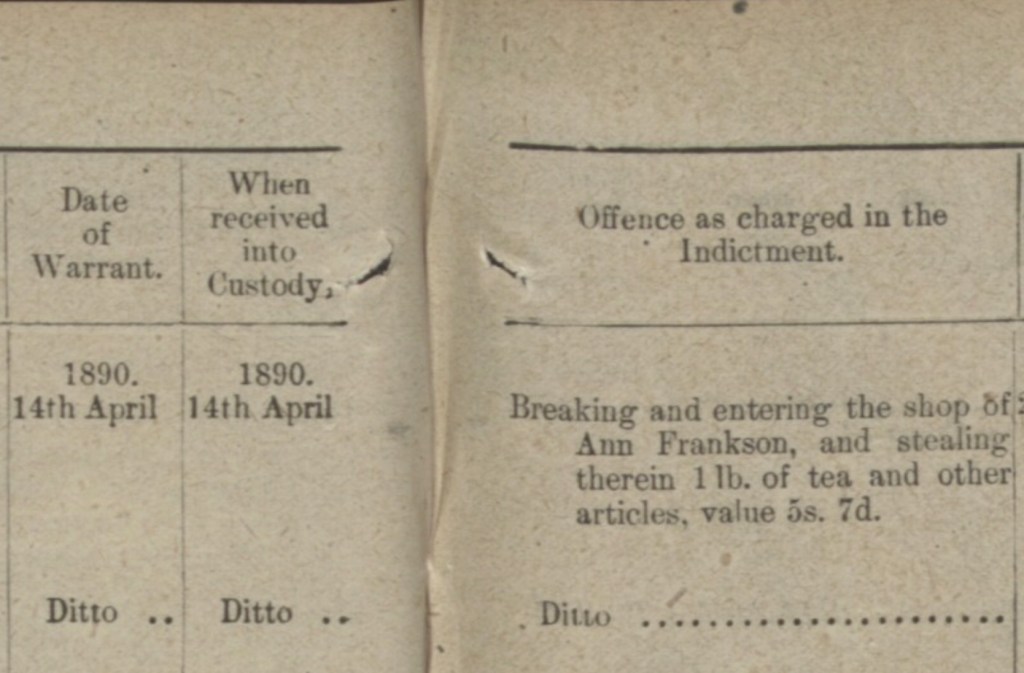 John was taken into custody on the same day, Monday the 14th of April, 1890, for trail at the Old Bailey Criminal Court for Breaking and entering as well as theft.