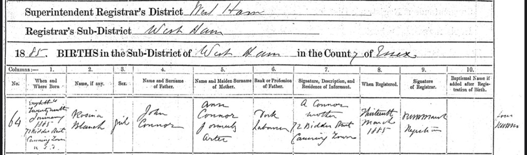John’s sister, Rosina Margaret O’Connor, was born on Saturday, the 29th of January, 1884, at their home, Number 72, Bidden Street, Canning Town, West Ham, Essex, England. Their mum, Ann O’Connor nee Arter registered her birth on the 13th March 1885. Ann gave her husbands name as, John Connor and his occupation as Dock Labourer. I am 100% sure this is the right birth certificate for Rosina as her late daughter Rose confirmed her date of birth. The thing that confuses me is her middle name. We were lead to believe it was Margaret but her birth certificate gives Blanch. However it is very common for the Irish Catholics to give a different name on birth certificates and baptism records.