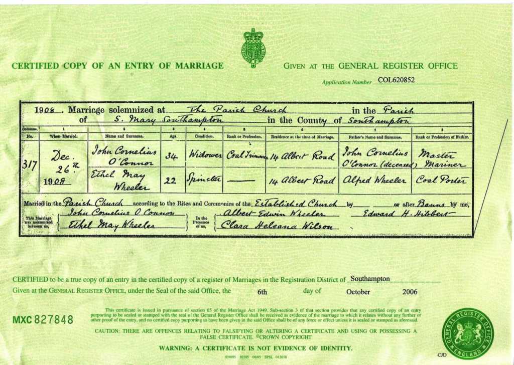 John and Ethel daughter, Dorothy Rose Emily O’Connor married Harold A E Croucher in Southampton, Hampshire, in December 1933 when she was 22 years old.