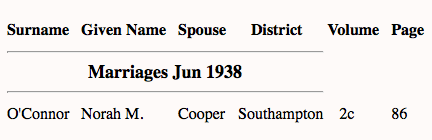 And their daughter, Norah Margaret O’Connor married John Walter Cooper on Monday the 18th of April, 1938, in the Southampton district.