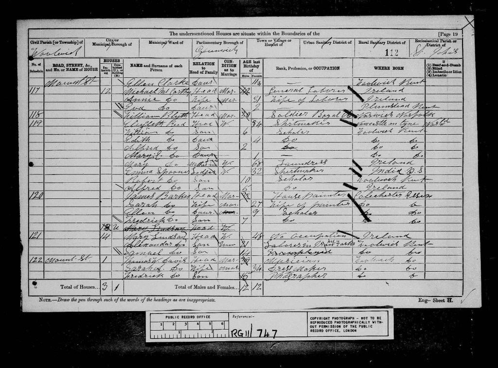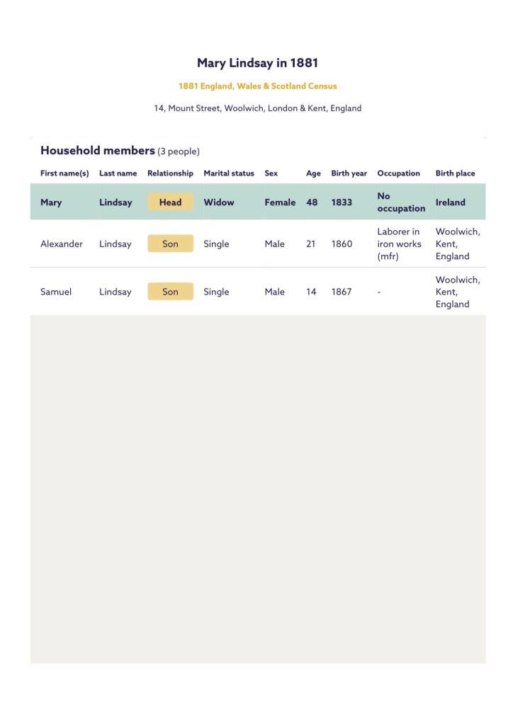 Mary thankfully had moved from their home of horrors and was residing at, 14, Mount Street, Woolwich, London & Kent, England on Sunday the 3rd of April 1881, which her sons, Samuel and Alexander. Alexander was working as a Laborer in the iron works.