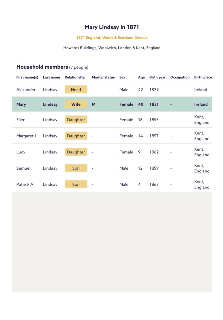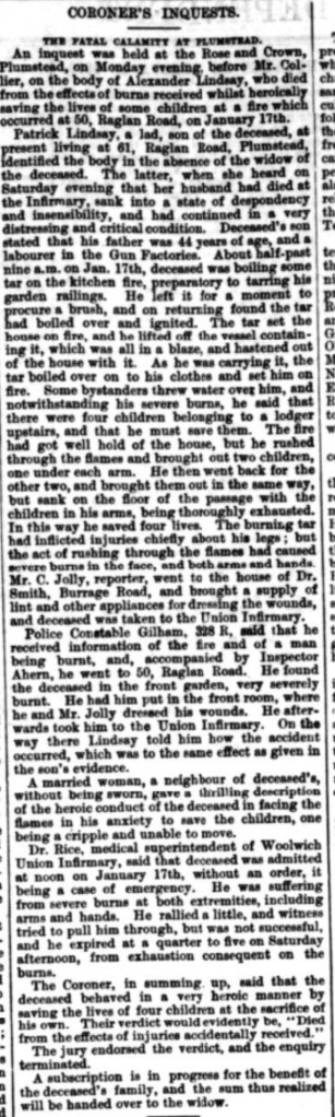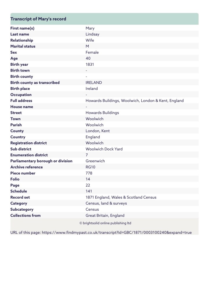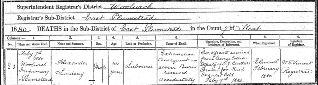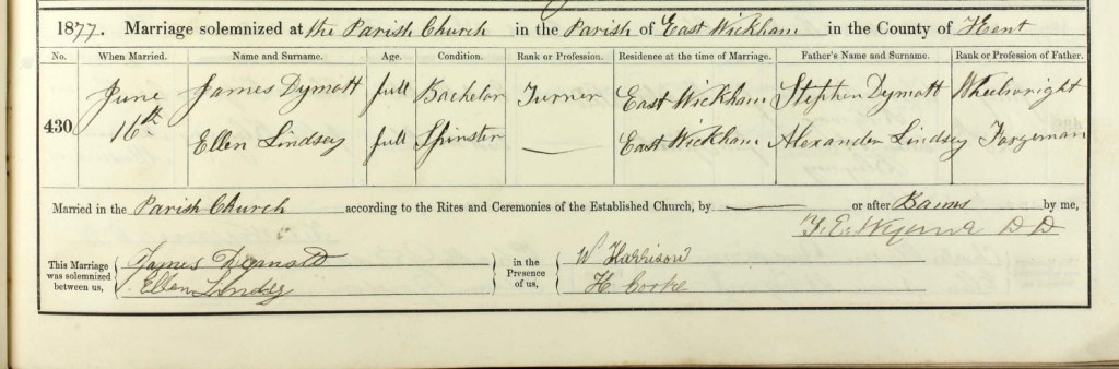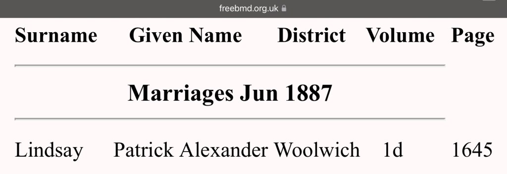 A good few years later, Mary and Alexander’s son, Patrick Alexander Lindsay married Ellen Jane Spratt in Woolwich, Kent, in June 1887.
