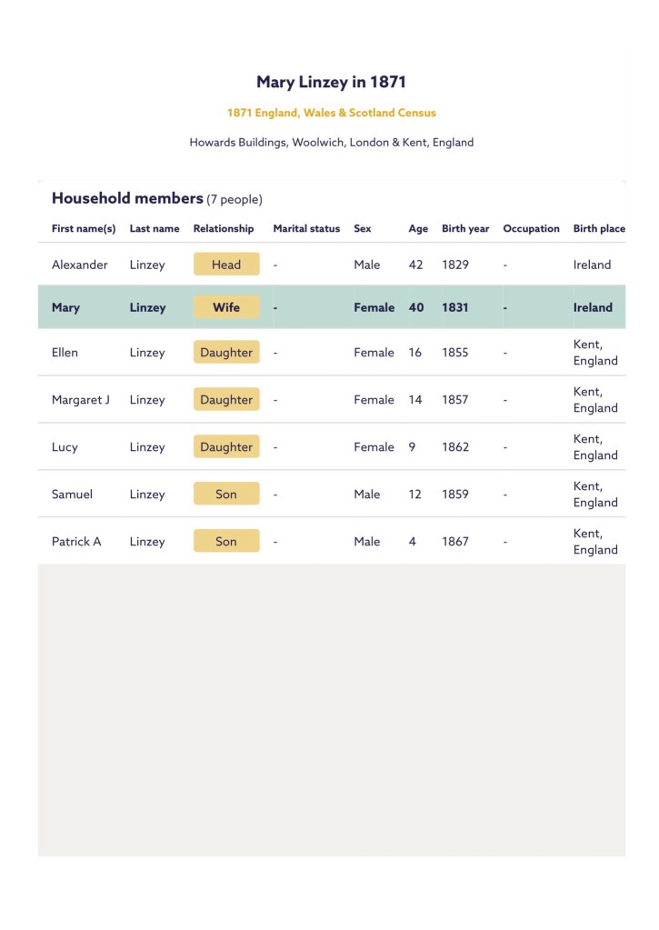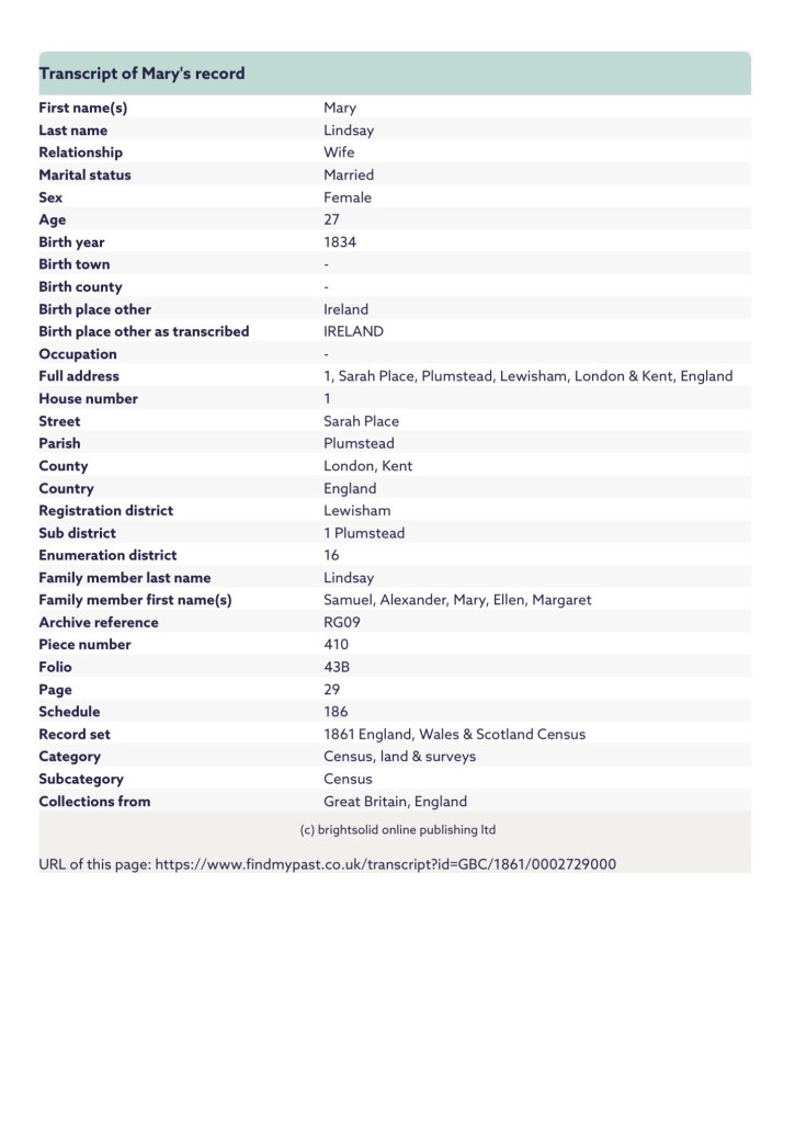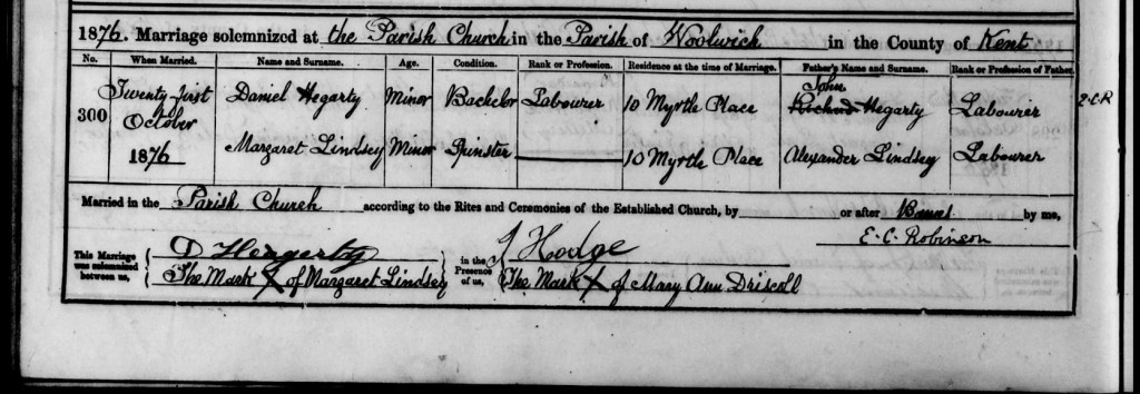 Speaking of her marriage, Mary Connor, a spinster of full age, married bachelor Alexander Lindsay, a full aged Labourer, on Monday the 21st of August, 1854, at St Mary Magdalene, the Parish Church of Woolwich, Woolwich, Kent, England. They left their mark. They gave their fathers names as Peter Lindsay, a Labourer and Patrick Connor, a farmer. Mary was residing at 5 Shorts Alley and Alexander at, 39 Red Lion Street, at the time of their marriage. Their witnesses were Marys brother Thomas and sister In-law, Margaret Cook nee Carroll. Her brother and sister in-law Thomas and Honora Connor nee Carroll, we’re siding at 5 Shorts Alley in 1851.