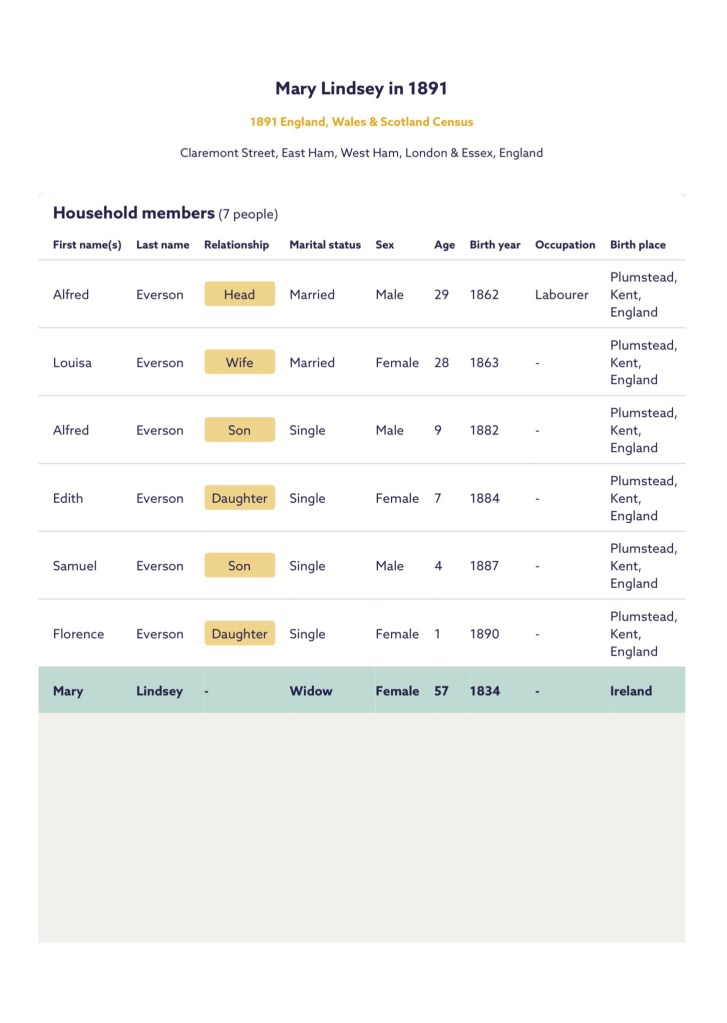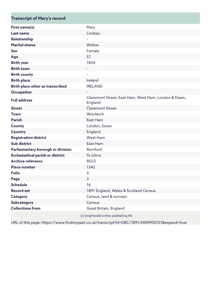 It shows that Mary, was residing at Claremont Street, East Ham, West Ham, London & Essex, England with her daughter Lucy/Louisa Everson nee Connor and her family, on Sunday the 5th April 1891.