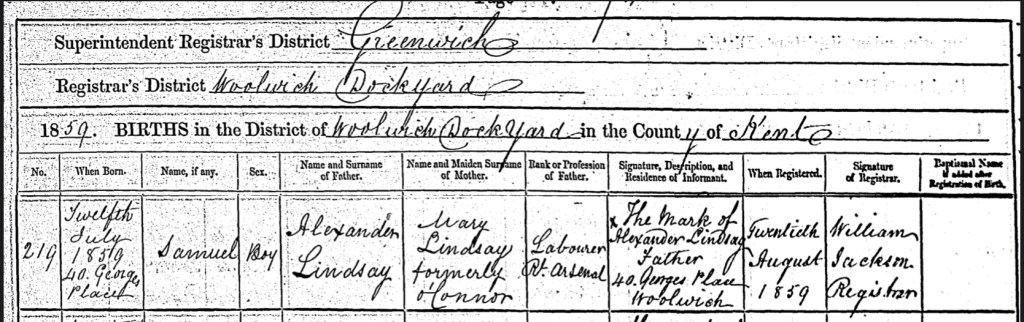 She gave her husband Alexander’s occupation as a Labourer in the Dockyard and their abode as, Number 21, Upper Harden Street, Woolwich.