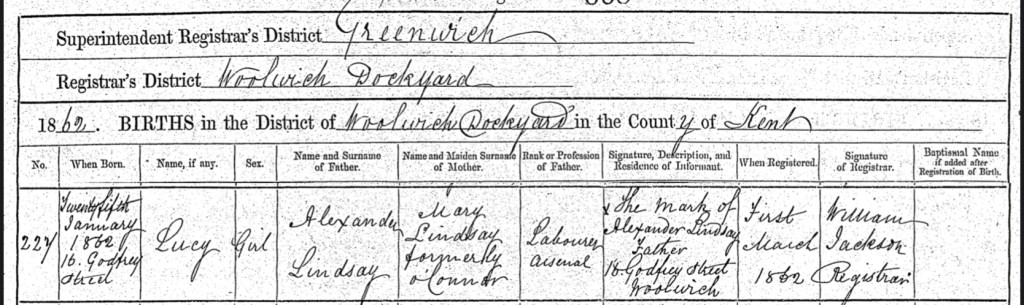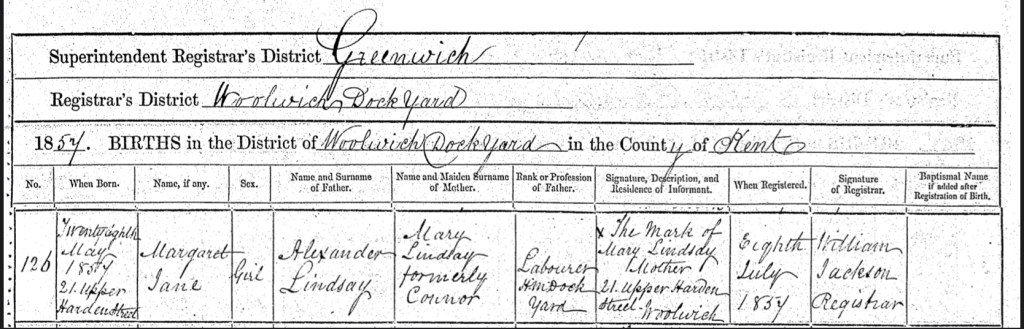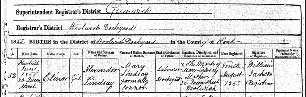 Mary gave birth to Alexander’s and her daughter, Elinor Lindsey, on Wednesday the 13th of June, 1855, at Number 25 Queen Street, Woolwich Dockyard, Woolwich, Kent, England. Mary registered Elinor’s birth on Friday the 10th of August 1855 in Greenwich. She gave her Husband and Elinor’s father name as Alexander Lindsay, a Labourer at the Dockyards and their adobe as Number 25 Queen Street. Mary left her mark. Her baptism records show her birth date as, the 11th July 1855.