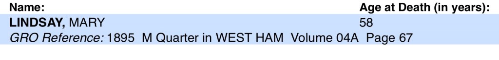 This is we’re Mary’s life story comes to a sad end, as the next documentation I have for her is her death index which states, Mary Lindsay nee Connor, died in the January to March quarter of the year 1895, in West Ham, Essex, England.