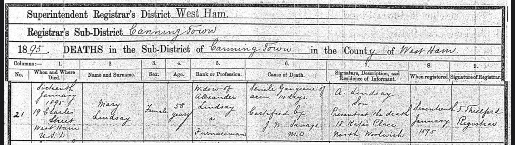 Marys son, Alexander, of number 18, Kate’s Place, North Woolwich, was present and registered Mary’s death on Thursday the 17th of January, 1895.