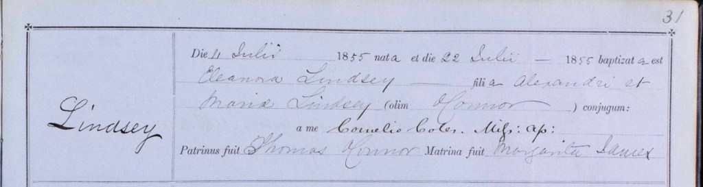 Mary and Alexander baptised their daughter, Elinor Lindsay, at St. Peter the Apostle Roman Catholic Church, Woolwich, Kent, England, on Sunday the 22nd of July, 1855.