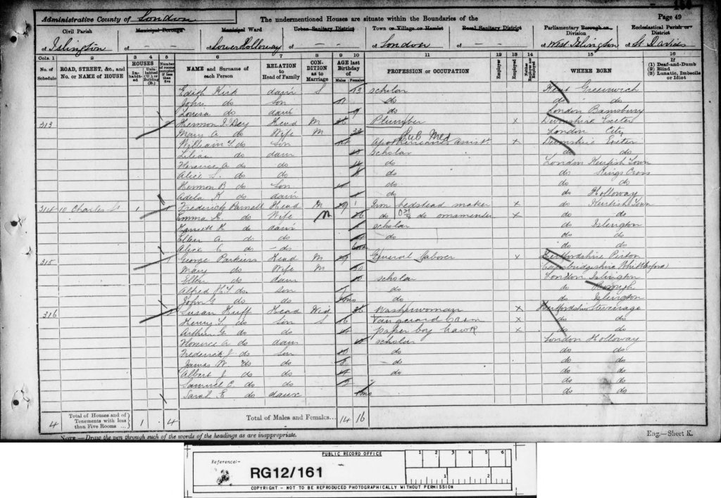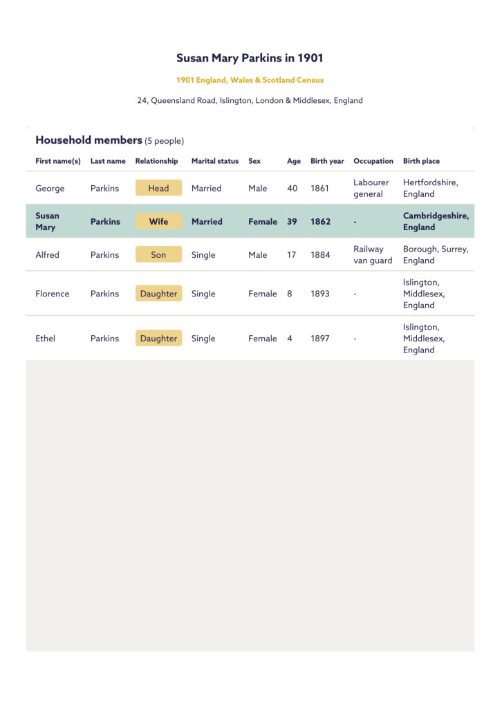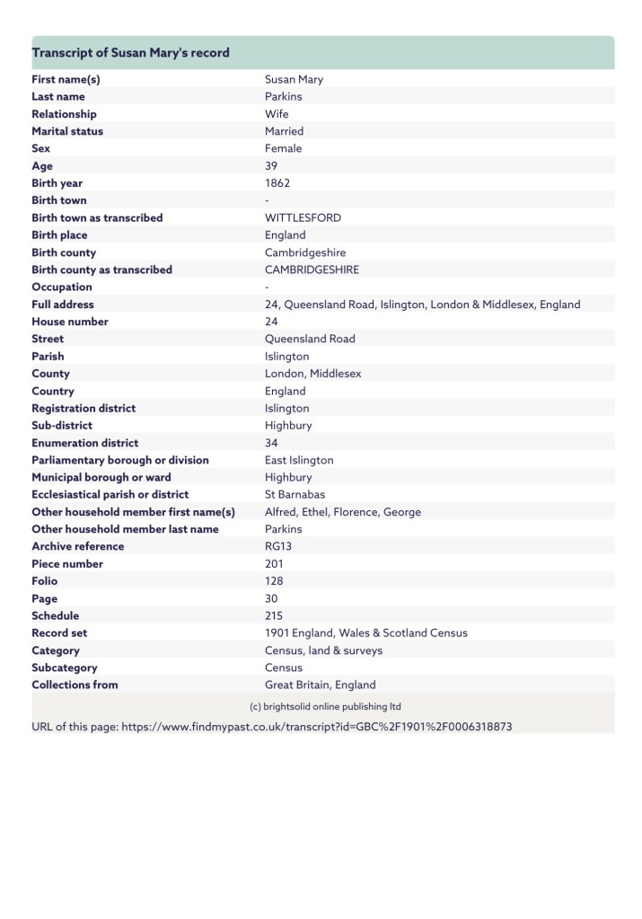 And the 1901 census was taken on Sunday the 31st of March, 1901, which showed Susan, George, Ethel, Florence and Alfred, residing at, 24, Queensland Road, Islington, London & Middlesex, England.
