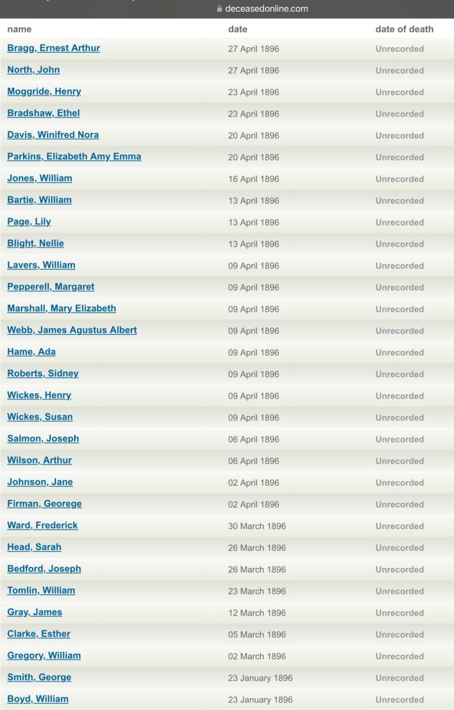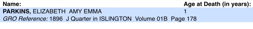 Happiness was very short lived as, on the same day as Elizabeth’s baptism, Susan and George’s Daughter, 15 month month old, Elizabeth Amy Parkins, sadly passed away on Thursday the 16th of April 1896, at their home, Number 68 Wellington Road, Islington, London, England.