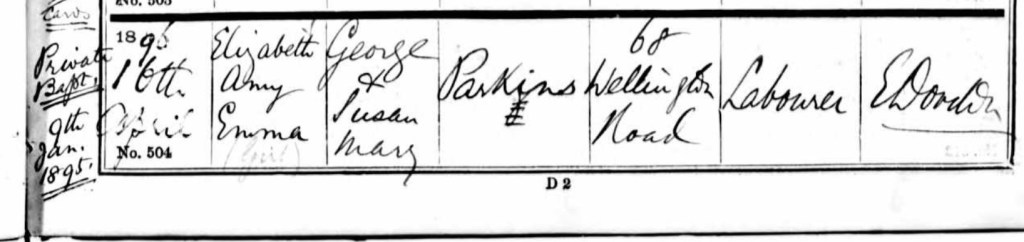 Susan and George, baptised, Elizabeth Amy Emma Parkins, on Thursday the 16th April 1896, at St David’s, Middlesex, England.