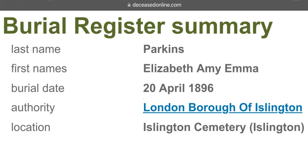 Elizabeth Amy Emma Parkins, was laid to rest on Monday the 20th of April 1896, in Islington Cemetery, Islington, Middlesex, England, in a open grave, grave reference M/Poor/17568, with 30 other people.