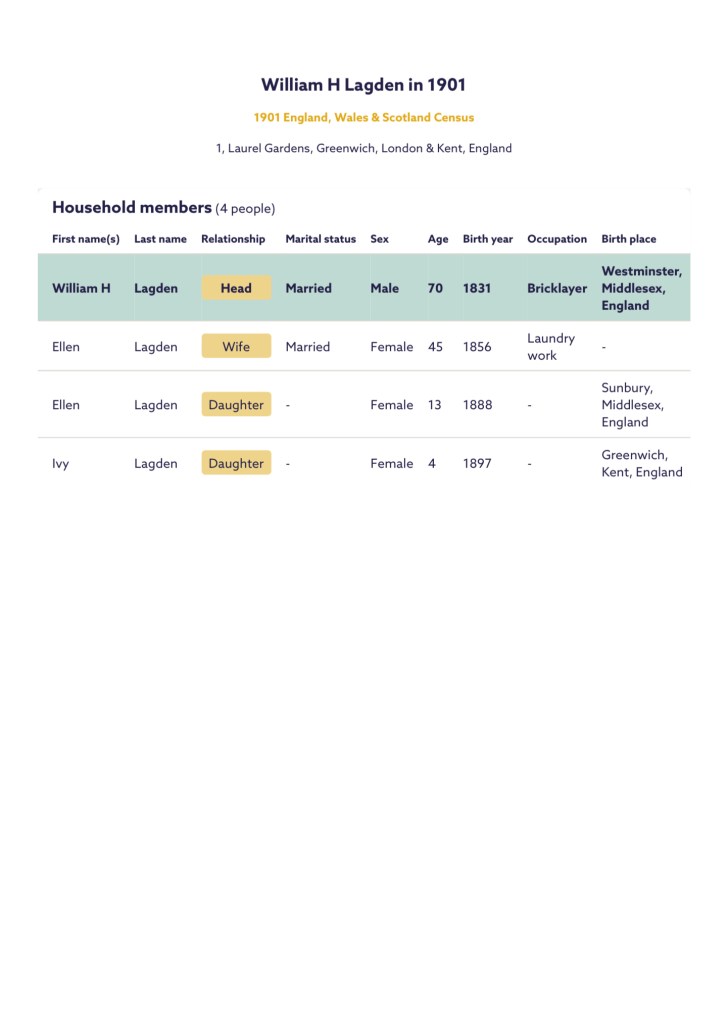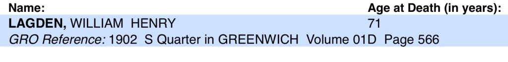 His widow Ellen Lagden was present and registered Williams death, on Thursday the 31st of July 1902, in Greenwich.