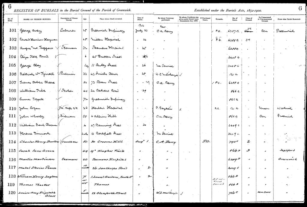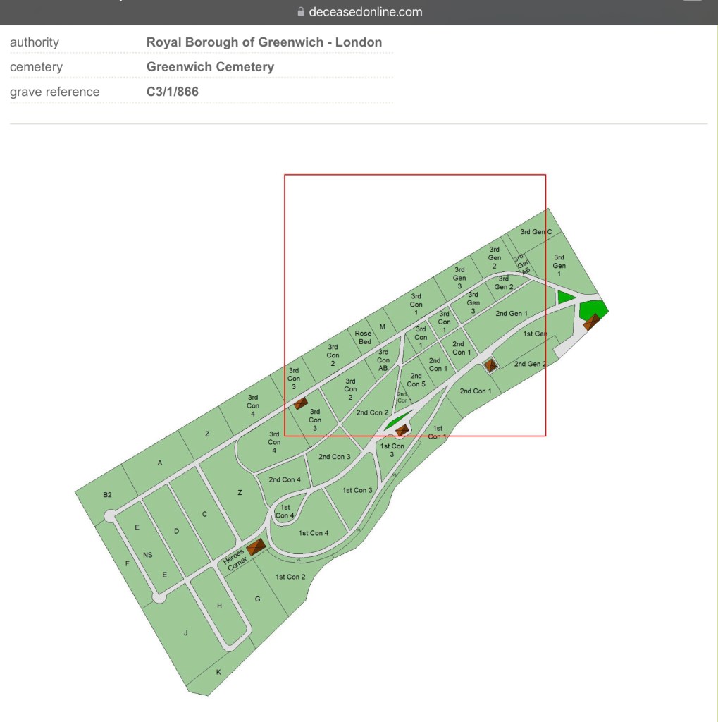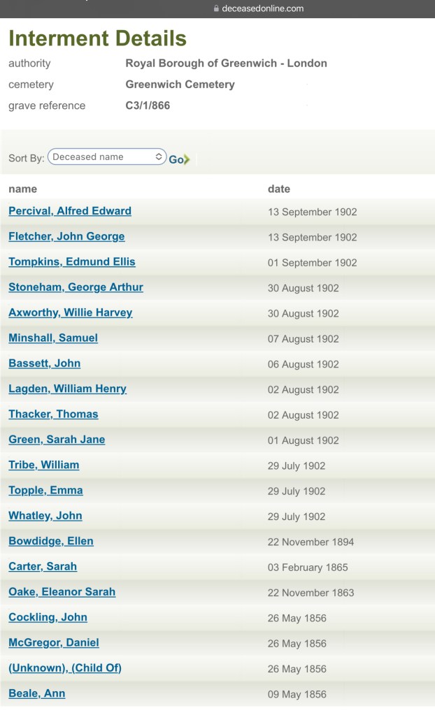 Susan’s Father, William Henry Lagden was laid to rest on Saturday the 2nd of August 1902, at Greenwich Cemetery, Greenwich, London, England. He was buried with 19 others, in Grave reference C3/1/866. They were, William Henry Lagden And Thomas Thacker, 02nd August 1902.