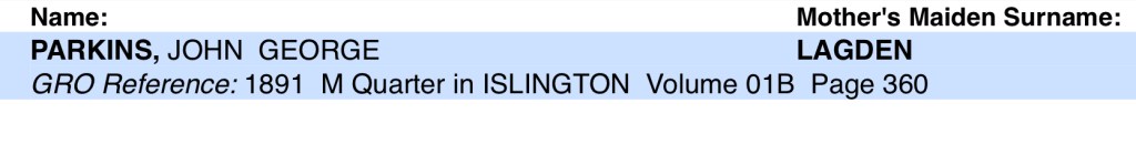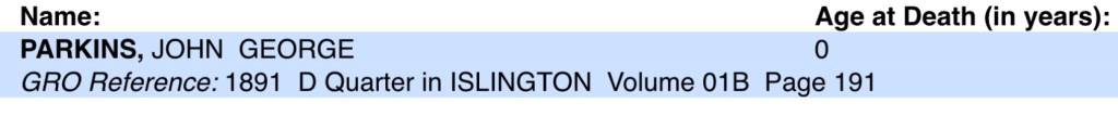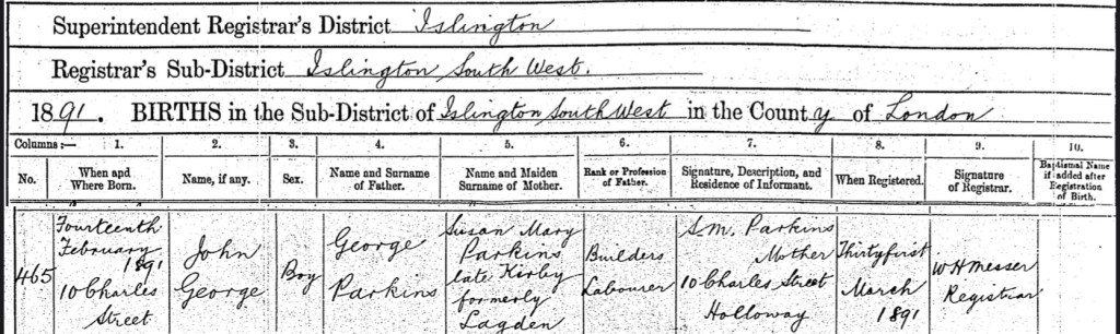 Susan and George’s son, John George Parkins, was baptised in a private baptism at his home, 10 Charles Street, Islington, Middlesex, England, on the 10th July 1891. His baptism gives his birth date as the 14th February 1891.