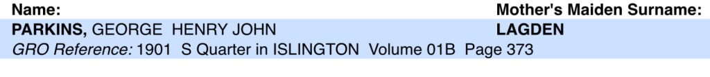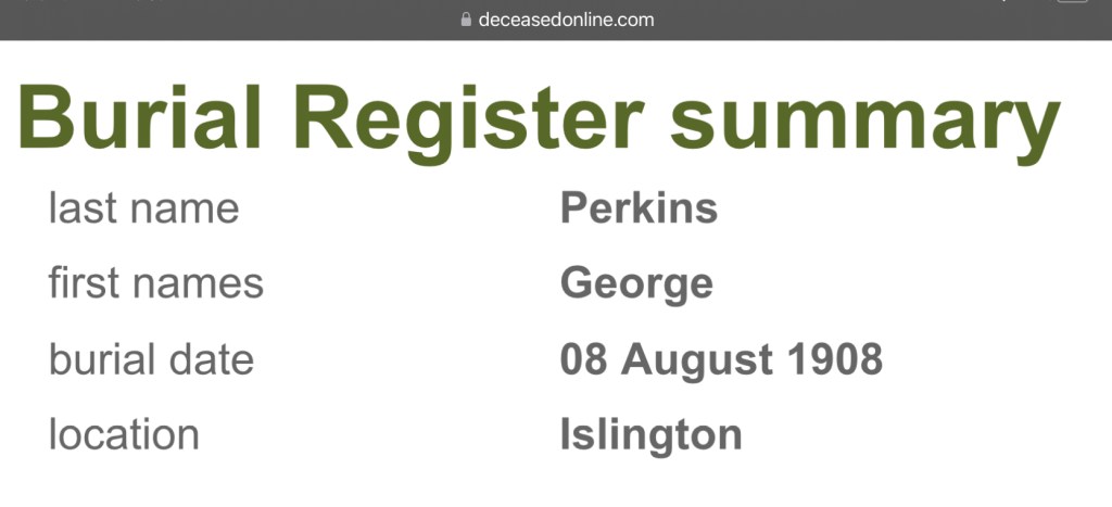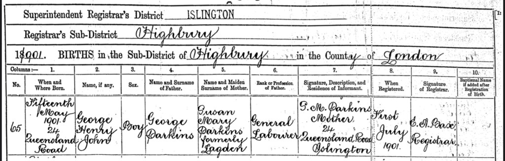 George’s widow, Susan Mary Parkins, nee Kirby, nee Lagden, registered George’s death on Saturday the 1st of August 1908, in Islington. She gave their abode as, 22 Queensland Road, Islington.