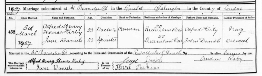 And Susan’s son, 23 year old bachelor, carman, Alfred Henry Thomas Kirby married 23 year old, Spinster, Jane Daniels, Daughter of John Daniels, on Sunday the 3rd of March, 1907, at St Barnabas Church, Hornsey Road, Islington, England.