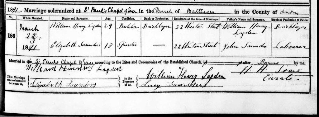 Another love story was beginning when, Susan’s Brother, 29 year old, bachelor, William Henry Lagden, a Bricklayer, married 18 year old, spinster, Elizabeth Saunders at St. Paul’s Chapel Of Ease, Battersea, London, England, on Monday the 23rd of March, 1891. William and Elizabeth were both residing at, 22 Weston Street, at the time of their marriage. They gave their fathers names and occupations as, William Henry Lagden, a Bricklayer and John Saunders, a Labourer. Their witnesses were, Susan’s and Williams father, William Henry Lagden and Lucy Saunders. (Possibly Elizabeth’s mother.)