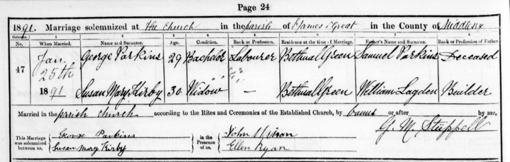 She married, a 29 year old bachelor, George Parkins, a Labourer, on Sunday the 25th of January, 1891, at St. James The Great, Bethnal Green, Middlesex, England.